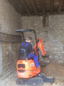 heute, 5.12.2015, musste das alte Holz des Dachstuhls des Nebengebäudes entsorgt werden. Mit schwerem Gerät ging es dem großen Stapel an den Kragen. Das Holz ist aber zu schade für den Container, deswegen haben wir es erst einmal zum trocknen in den Stall gesetzt. Auch unser Architekt beehrt uns auf der Baustelle und erkundet mit uns den Grund des Fundamentes. Schon vor über 100 Jahren muss es weitsichtige Baumeister gegeben haben, die die dicken Mauern einer Bruchsteinscheune auf ein breites und tiefes Fundament gestellt haben. Auch das alte Eternitdach muss weichen, weil dort in der kommenden Woche die Parkplattform entstehen soll….