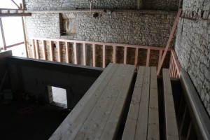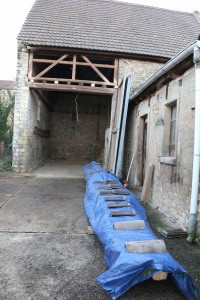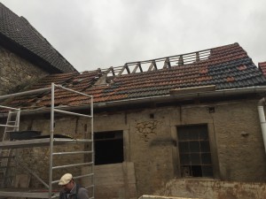 Freitag, den 27.11.2015 , fällt der Startschuss. Unser Zimmerer hat doch noch Zeit in diesem Jahr gefunden sich unserem Bauprojekt zu widmen und fängt an mit dem Abriss des Daches des Nebengebäudes und der Demontage des Heubodens in der Hauptscheune. Die Balken müssen entfernt werden, damit der Rohbauer die Fundamente und Bodenplatte in der Scheune errichten kann.